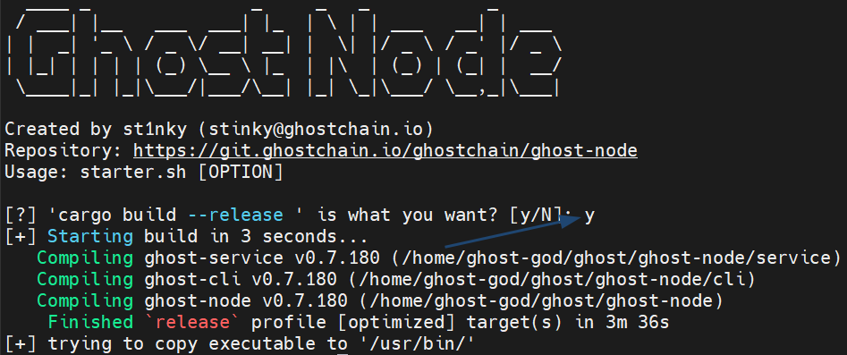 Type y and press Enter for create dedicated user for running ghost-node: